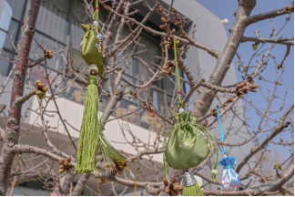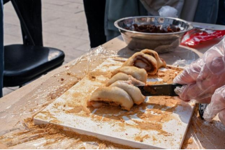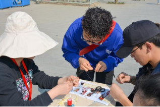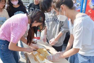 草长莺飞,串珠是春天里的点缀。在汉服社同学的指导下,同学们用小小珠子串起多多创意。阳光的照耀下,手串散发出清澈柔光,精致浪漫。春风拂过,驴打滚糕点制作处的糯米清香让人胃口大开,众多同学不禁参与其中。软和温热的面团裹上豆沙馅,撒上黄豆粉,软糯米香和豆沙清甜交融,一口下去,回味无穷。