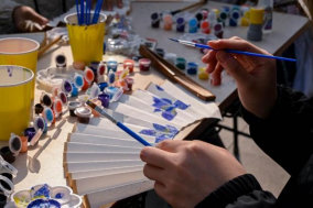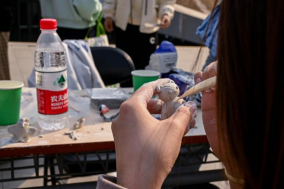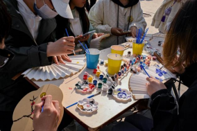 小巧轻灵,栩栩如生,小小泥人折射童年时光。捏泥人作为民间特色的手工艺之一,以其可塑造性和新颖明亮的上色颜料吸引了不少同学的参与。同学们在手间捏出各色创意,用色彩绘出心中所想。一旁的折扇摊位前,同学们正围坐在一起,凝神屏气,聚精会神,用画笔细致认真地绘制折扇。水墨色彩缤纷,笔尖灵感舞动,花朵灵动,枝干蜿蜒,景色变换体现世界的缤纷。