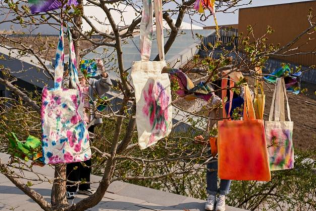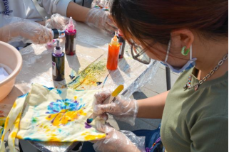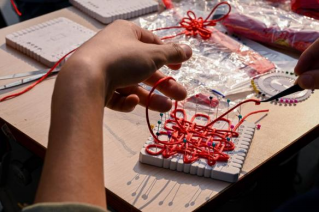 移步到中国结制作现场,在负责人的指导下,丝丝红绳飞舞,在同学们手间缠绕,一个个寄寓了吉祥如意的中国结诞生。而在扎染的现场,同学们用染料在白帆布包上发挥着自己的想象力和创造力。色彩可浓重也可素雅,布染山水,漫享悠然,既有民族特色,又有现代韵味。