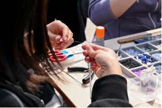 花可以把春天治愈,也可以治愈自己。缠花摊位的同学们在负责人指导下挑选出心仪的丝线和纸模,将纸模附在铜丝上,用彩线缠绕出精美的叶片,组合成精妙绝伦的艺术品。微风袭来,寻找一缕香味来到香囊制作摊位,同学们精挑着五彩挂绳,将香草装入香囊,在制作中体验雅致香道,邂逅传统香学魅力,寄寓春天的美好愿望。