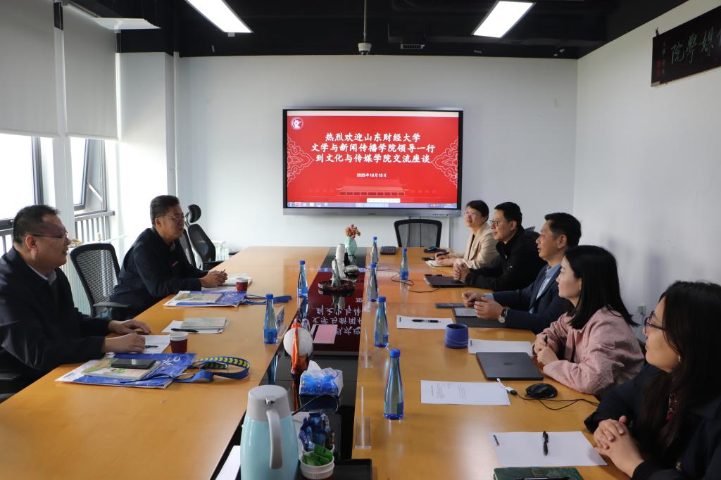 2025年10月15日上午,山东财经大学文学与新闻传播学院党委书记杜啸尘和院长、党委副书记张超一行来我院就学科建设与学院发展等事宜进行调研交流。座谈会由朱飞院长主持,副院长司聃、戴俊骋,党委副书记、纪委书记宗娅琮,党委组织员张琳琳等参加座谈交流。