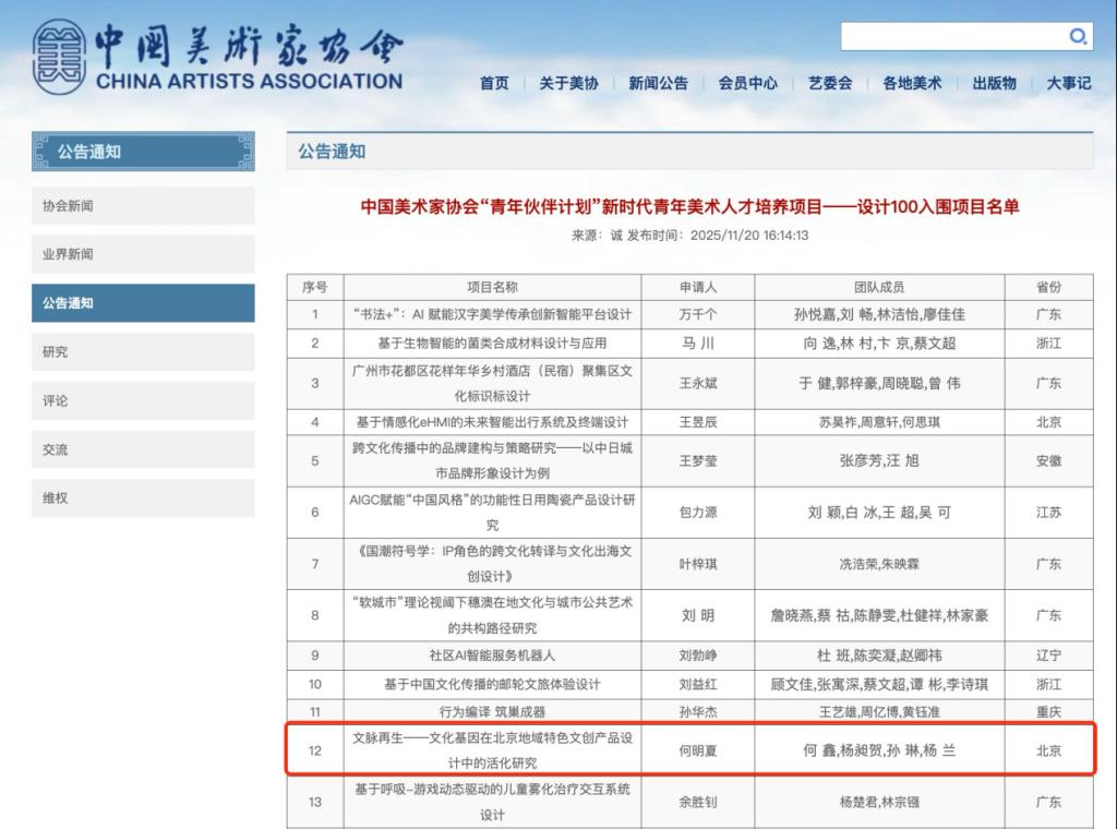 近日,中国美术家协会公布入围“新时代青年美术人才培养项目——设计100”名单,我院艺术系视觉传达设计专业教师何明夏所申请项目《文脉再生——文化基因在北京地域特色文创产品设计中的活化研究》获选,团队成员包括艺术系视觉传达设计专业教师孙琳、研究生杨兰。