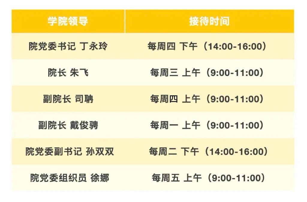本次接待地点均设置在学院13号楼231室,具体接待领导与时间安排如下:
