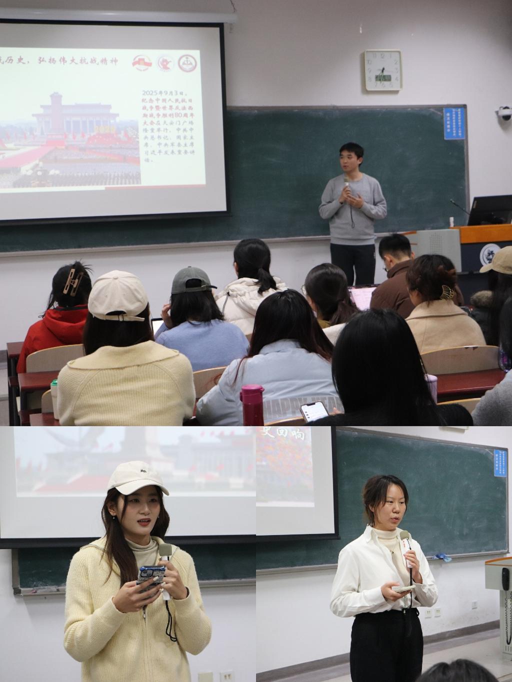 在主题宣讲环节,校研究生宣讲团讲师、国际经济与贸易学院2025级研究生张一笑以“凝聚民族复兴磅礴力量的文化基石——抗战旋律中的历史回响”为题,从学校合唱团参与“九三阅兵”的动人故事讲起,深入阐释《松花江上》《保卫黄河》等经典抗战歌曲的创作背景与精神内涵,生动展现了中财学子以文艺形式传承红色基因、践行“强国复兴,有我担当”的青春风采。刘登科、吕宜函、肖瑶分别结合自身参与“九三阅兵”的珍贵经历、参观中国人民抗日战争纪念馆的见闻与感悟、曾经的军旅经历等,分享了对抗战精神时代价值的理解,以及新时代青年如何从抗战历史中汲取力量,强化使命担当。