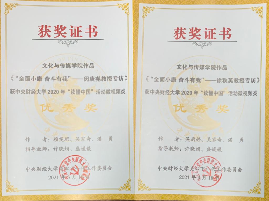 《“全面小康 奋斗有我”——徐秋英教授专访》获中央财经大学2020年“读懂中国”活动视频类优秀奖(作者:吴雨婷、吴家奇、谌勇,指导老师:许晓娟、盛媛媛)